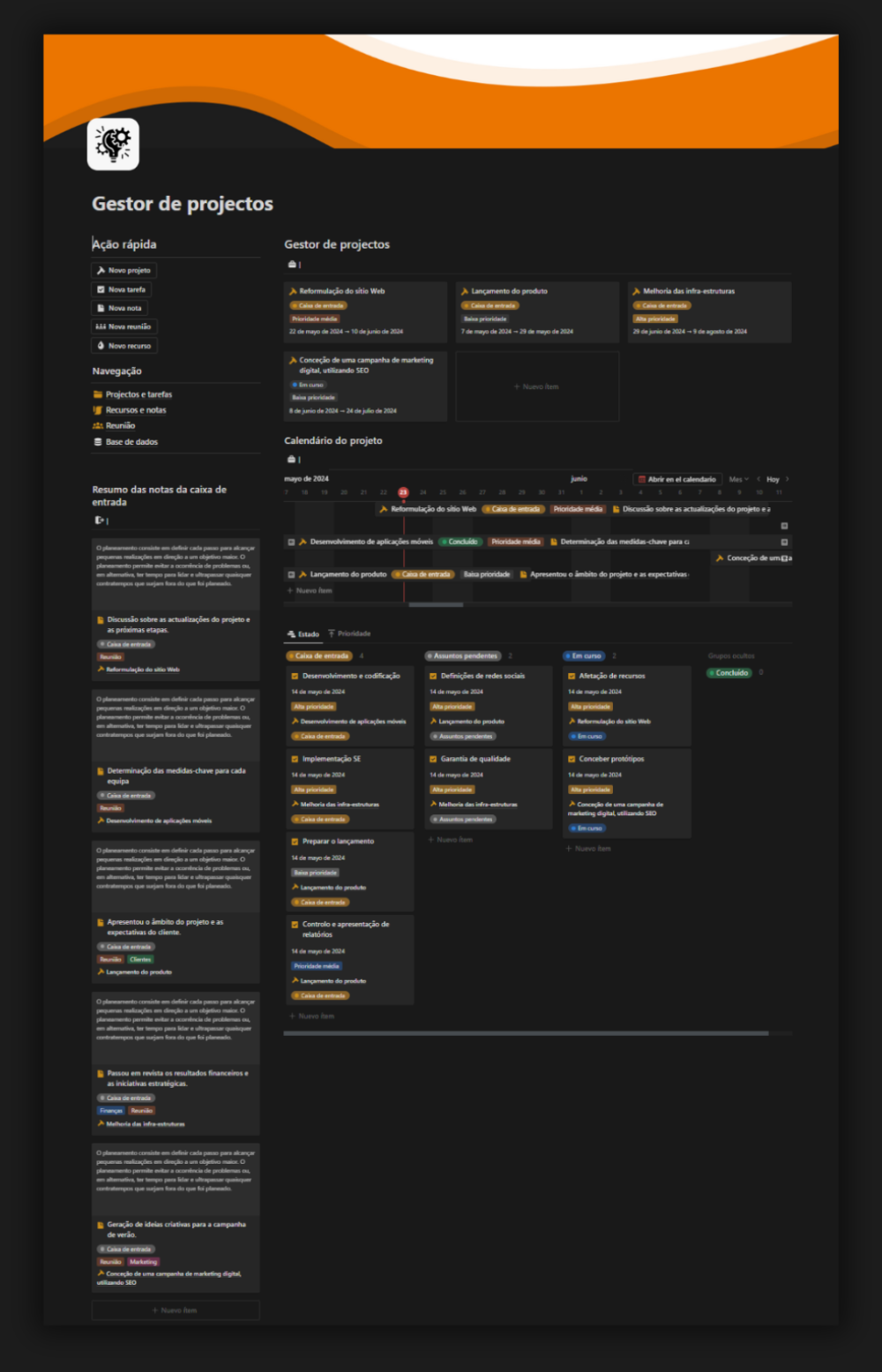 Gerenciamento centralizado de todos os seus projetos: Com o nosso modelo, você pode ter uma visão geral de todos os seus projetos em um só lugar. De projetos em andamento a iniciativas futuras, você terá uma visão geral completa do seu portfólio de projetos.