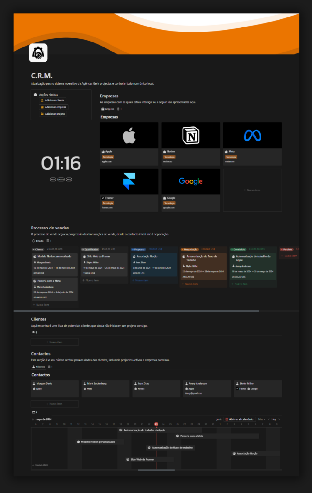 Rastreamento organizado de projetos relacionados a clientes: Com o nosso modelo de CRM, você pode manter um controle detalhado de todos os projetos relacionados aos clientes. De propostas de vendas a implementações de serviços, você terá uma visão clara do status de cada projeto e poderá garantir uma entrega pontual e de qualidade.